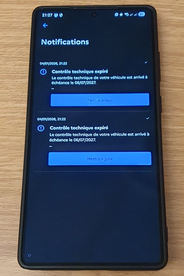 Voulant vérifier que tout se passait toujours bien dans cette application dont le but est tout de même de nous faciliter la vie, nous l'avons lancée. Avec surprise elle nous affichait deux nouvelles notifications. Mais pourquoi ça ? Sommes-nous victimes d'usurpation d'identité ? Nos voitures ont-elles été repérées lors d'un refus d'obtempérer ? Rien de tout ça, l'application nous juste informe qu'hier 4 janvier 2026 à 21h22, que les contrôles techniques de nos deux véhicules sont arrivés à échéance le 06/07/2027. Promis juré, nous ne possédons pas la DeLorean du Docteur Emmett Brown et pour cette raison nous nous demandons vraiment pourquoi nos contrôles techniques sont arrivés à échéance dans le futur ?