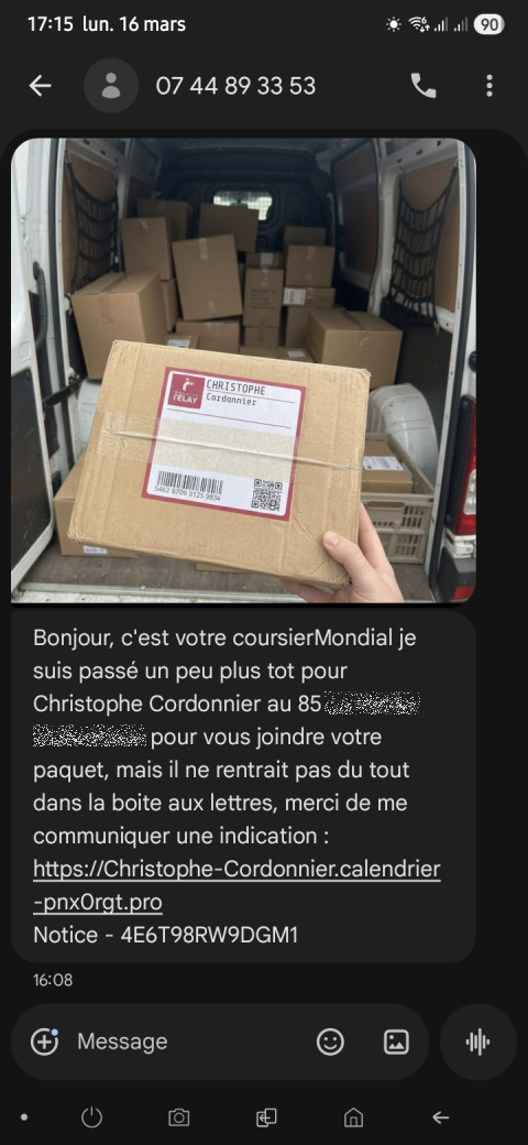 Ayant mon bureau qui donne sur l'entrée du jardin de ma maison, je suis certain que c'est une arnaque. Comment aurais-je pu louper ce gros camion devant chez moi ? Pire, pour Mondial Relay, seuls les lockers me permettent de récupérer mes colis. Ca me permet de faire un peu de sport en déstockant mon vélo électrique ;) Recevez vous le même type de message et avez-vous fait le même constat ? |