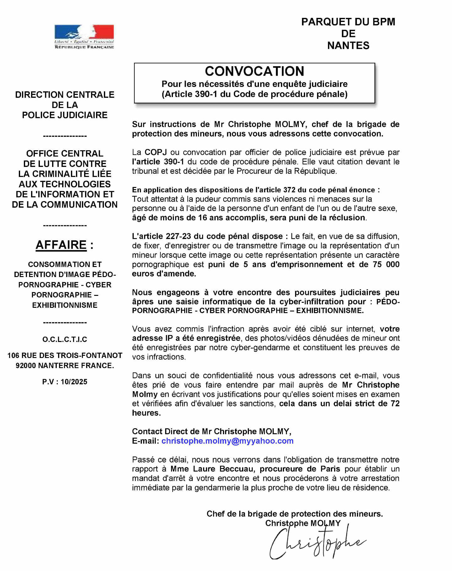| Avec l'avènement du numérique et le fait que nous possédons quasiment tous une adresse email, nous sommes malheureusement devenus une cible de ce qu'on appelle l'horrible SPAM. S'il est compliqué de s'en prémunir totalement certains mécanismes techniques permettent de limiter les choses, sans totalement les bloquer complètement. Nous venons par exemple de recevoir une convocation à cause de pédopornographie, cyberpornographie et exhibitionnisme prouvée de notre part.