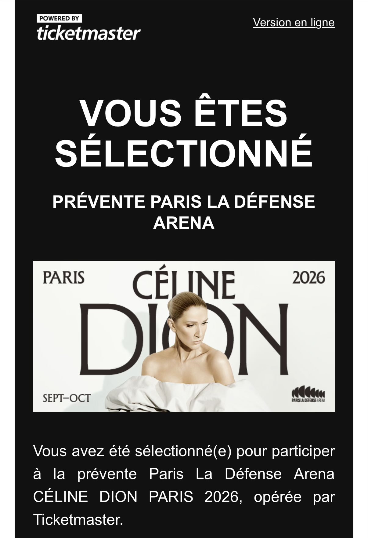 | Artiste francophone à la notoriété mondiale, Céline Dion fait partie des personnes qui arrivent, sur leur seul nom, à remplir des salles et même des stades, plusieurs mois à l'avance. Si vous êtes un minimum connecté, vous n'avez pas pu manquer la procédure de préinscription à laquelle il fallait suivre afin d'espérer pouvoir être tiré au sort afin de pouvoir acheter jusqu'à 6 places de concert dont les tarifs vont de 89,50 à 298,50 Euros. Les résultats arrivant progressivement, nous profitons de l'occasion pour féliciter tous ceux qui auront gagné le droit de dépenser leurs économies.